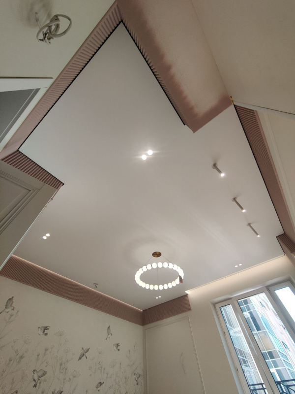 В СТОИМОСТЬ ВКЛЮЧЕНЫ установка натяжного потолка, полотно на выбор матовое, сатиновое или глянцевое, установка 1 люстры в каждую комнату, 1 обвод трубы и установка декоративной вставки.